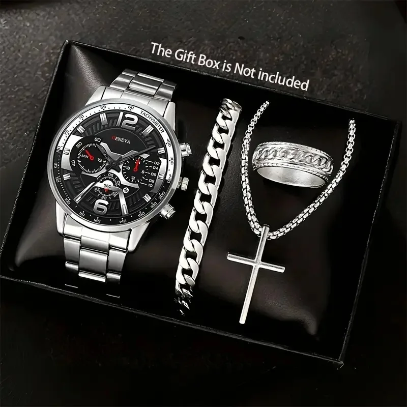 4pcs Luxury Men Business Quartz Watch Gold Alloy Roman with Calendar Wrist Watch Cross Necklace Bracelet Ring Set Men’s Gift