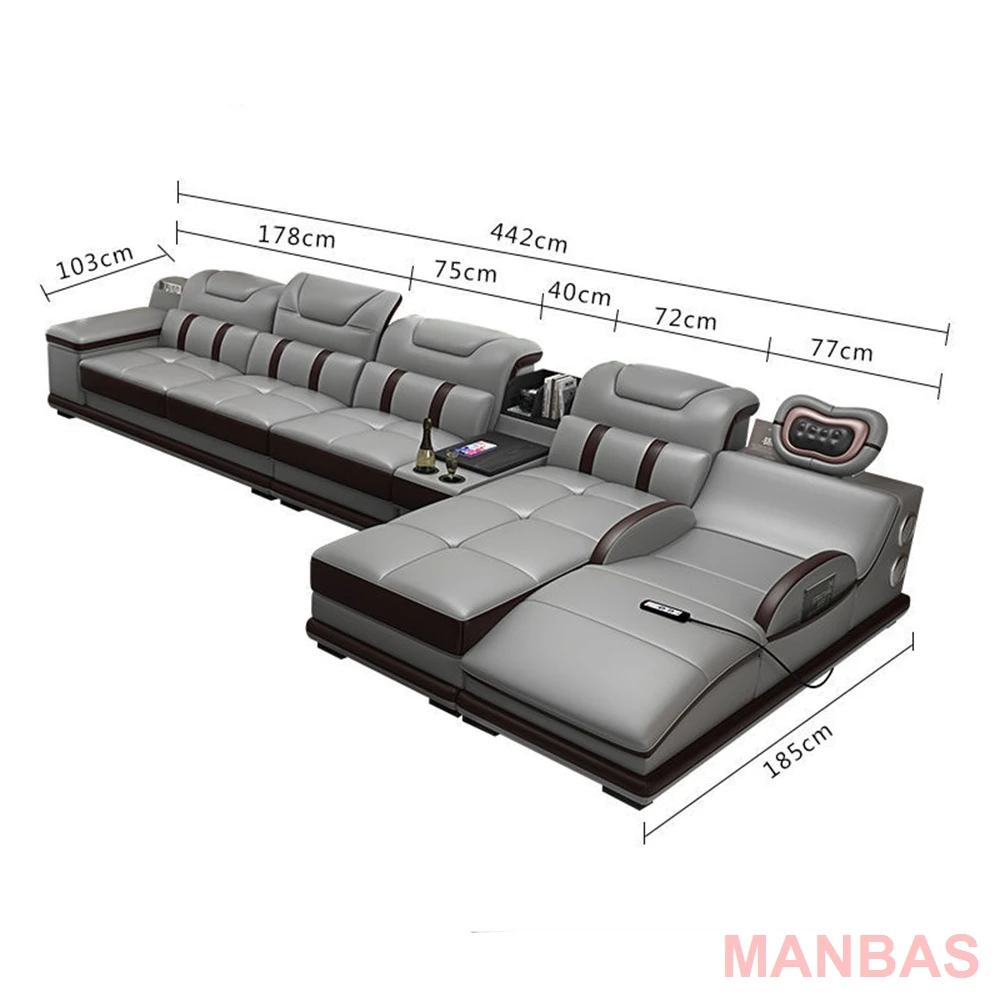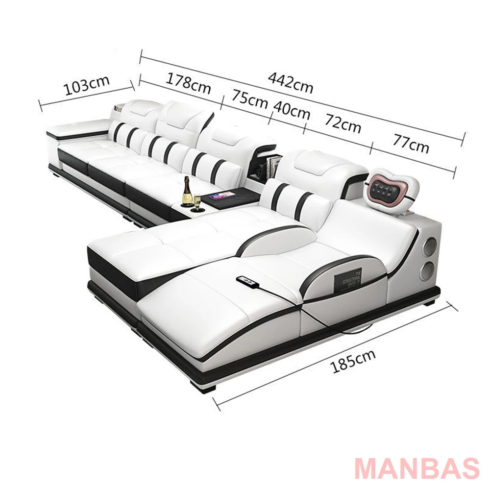 MANBAS Italian Genuine Leather Sectional Sofa with Bluetooth, Speaker, Functional Headrest, Massage Chaise L Shape Corner Sofas